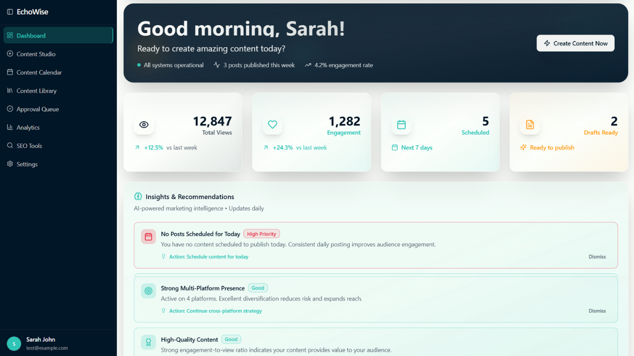 Watch how EchoWise transforms a simple content idea into a complete multi-platform campaign. From AI research to final publication, every step is streamlined and intelligent.