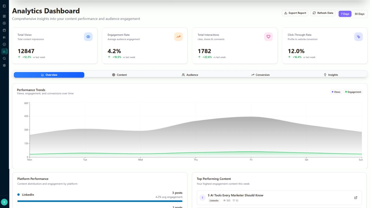 Track what works, identify top-performing content, and optimize your strategy with comprehensive analytics. See real-time performance across all platforms in one unified dashboard.