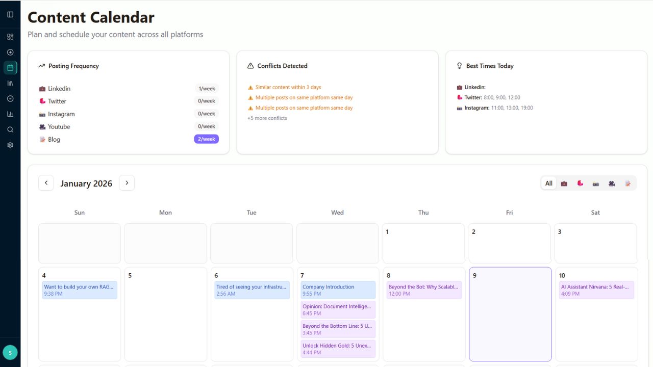 Our AI-powered content calendar analyzes your audience behavior and platform algorithms to schedule posts at optimal times for maximum engagement and reach.