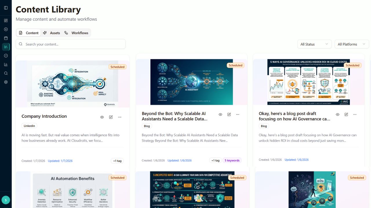 Organize, manage, and repurpose all your content from one central library. Track performance, schedule posts, and maintain brand consistency across all platforms.